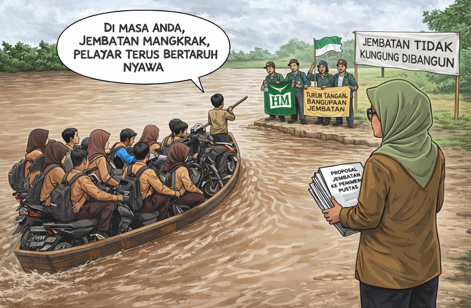 Ketua umum HMI Lampung Timur menilai kondisi tersebut sangat berisiko terhadap keselamatan pelajar, terlebih saat cuaca buruk atau debit air sungai meningkat. Ilustrasi: Rembes.com.