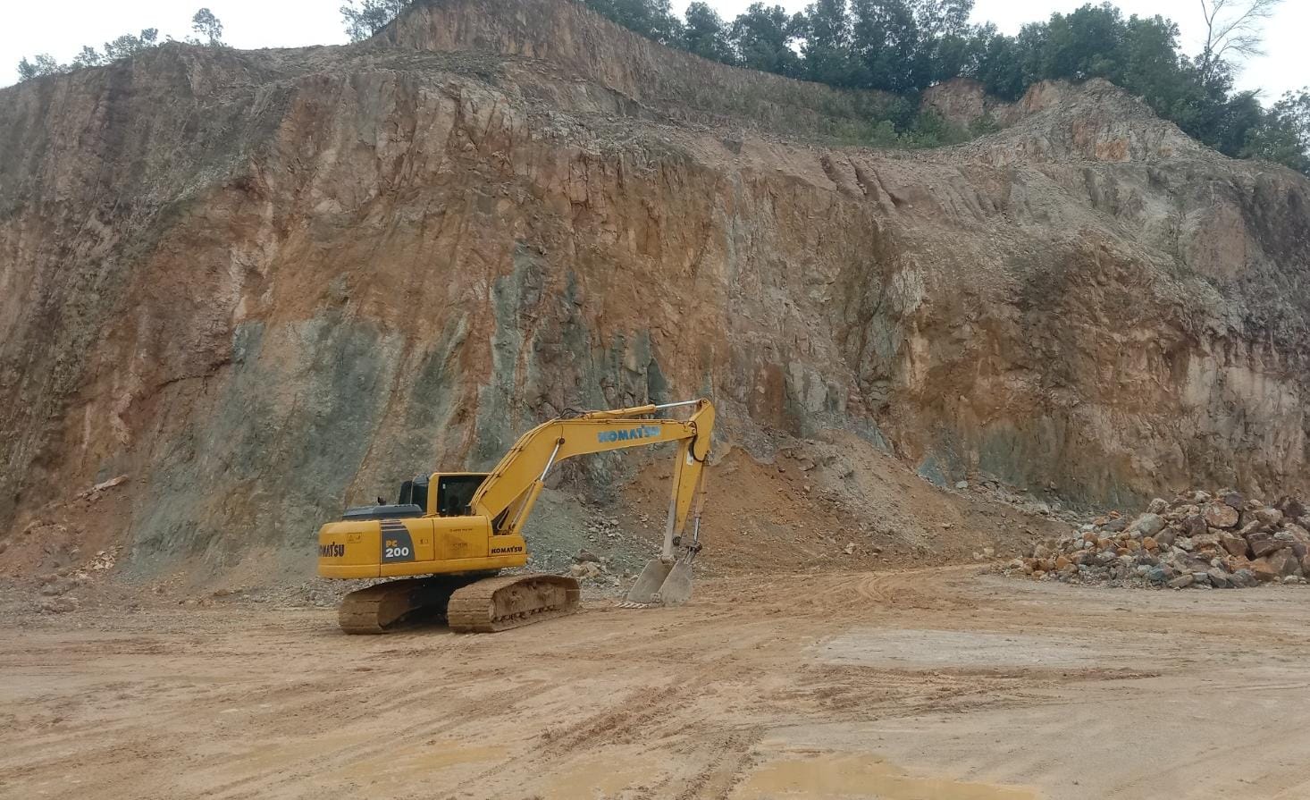 Pantauan di lapangan menunjukkan kegiatan penambangan terbuka masih berlangsung. Sejumlah ekskavator terlihat mengeruk batuan, sementara truk pengangkut hilir mudik membawa material keluar dari lokasi tambang.