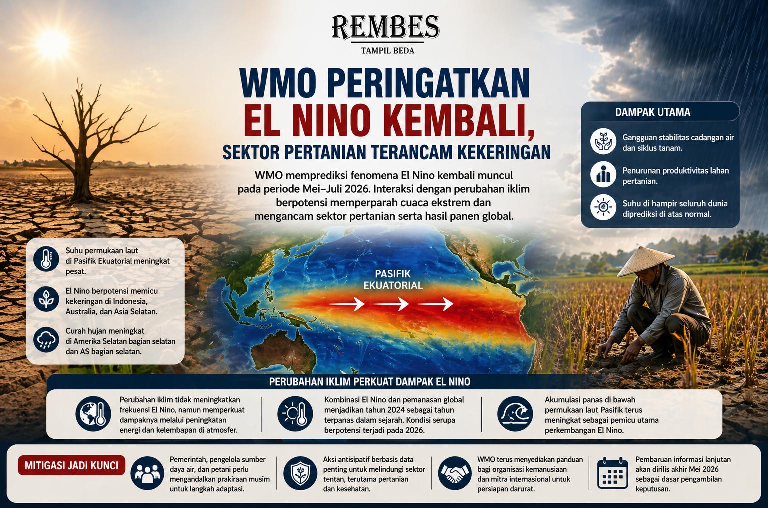 Rembes.com, Bandar Lampung – World Meteorological Organization (WMO) memperingatkan potensi kembalinya fenomena El Nino yang diprediksi mulai muncul pada periode Mei hingga Juli 2026.